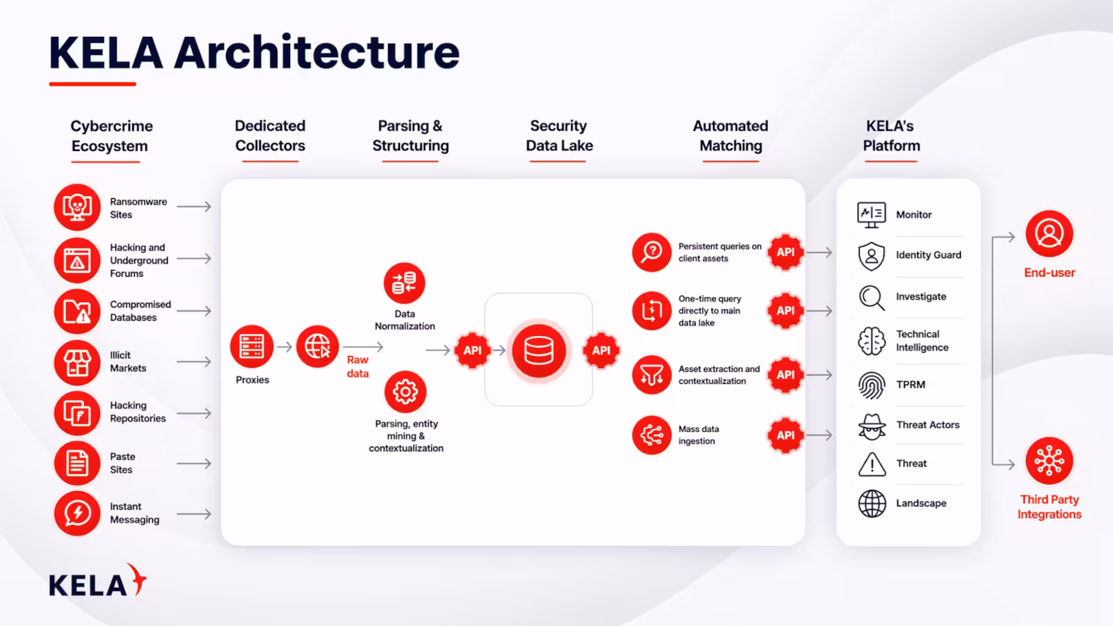 A arquitetura da KELA coleta dados brutos de centenas de fontes do ecossistema cibercriminoso — fóruns subterrâneos, blogs de ransomware, lojas automatizadas, mercados ilícitos, repositórios de hacking, grupos de Telegram e mensageiros instantâneos. Esses dados passam por parsing, normalização e contextualização em um data lake de segurança dedicado, alimentando todos os módulos da plataforma com correspondência automatizada em tempo real.